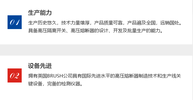 撫順電瓷廠電瓷電器公司是原機械工業部定點生產高壓隔離開關、高壓熔斷器、絕緣子、避雷器的骨干企業之一。生產歷史悠久,技術力量雄厚,產品質量可靠,產品遍及全國,遠銷國處。具備高壓隔離開關、高壓熔斷器的設計、開發及批量生產的能力。擁有英國BRUSH公司具有國際先進水平的高壓熔斷器制造技術和生產線關鍵設備,完備的檢測儀器。能夠批量生產符合國家和國際標準的3.6kv-40.5kv各種規格的戶內外高壓隔離開關、高壓限流熔斷器系列產品。產品在國家高壓電器質量監督檢測中心通過全部型式并取得了兩部鑒定和型號證書,是國家經貿委城農網改造的推薦產品,通過了ISO9002國際質量體系認證,曾榮獲機械部科技進步二等獎和地方優秀新產品獎。